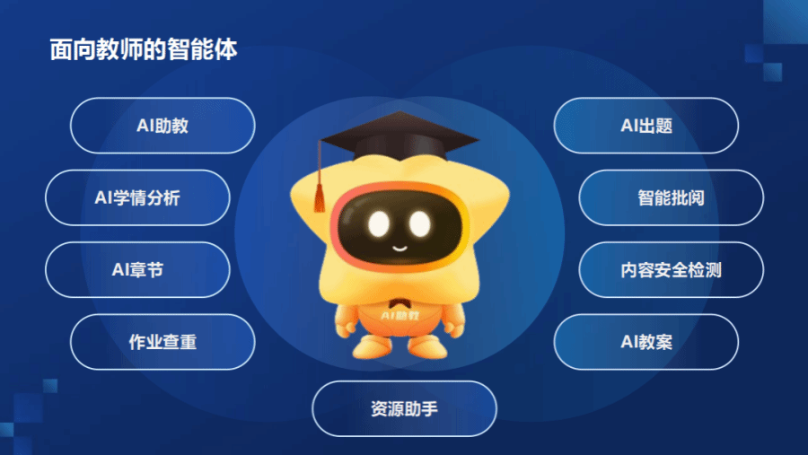 课程完成升级后,内嵌多个智能体,为教师提供智慧管理和智能决策支持,助力课程建设及教学全过程。例如,AI出题能够根据关联知识点和题型要求快速生成高质量的练习题,教师对AI生成的题目编辑修改或直接使用,极大减轻教师的备课负担;作业查重则可以帮助教师有效甄别作业抄袭问题,高效完成作业批改;AI学情分析能够在教师的指令下分析学生的出勤、作业等表现,实时、全面地洞察学生的学习进度,帮助教师及时反馈和调整教学策略,实现AI赋能教学全场景。