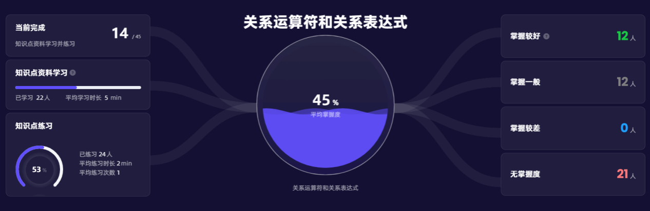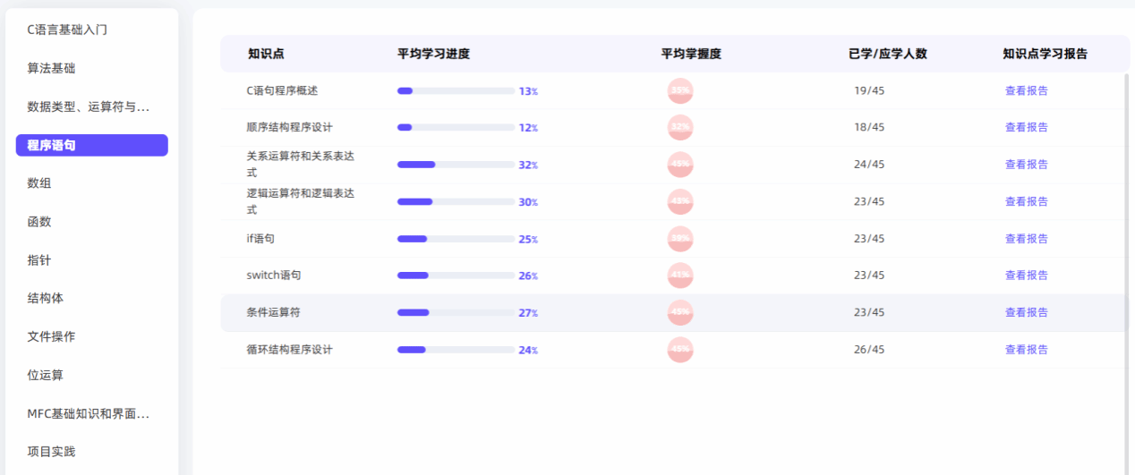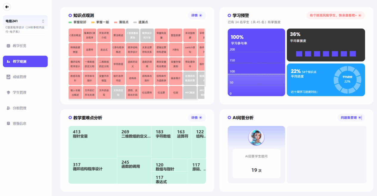教师通过知识图谱平台内的教学观察和成绩管理等模块,能精准获取教学数据反馈和学生学习画像,对处于中高风险区的学生进行学习预警分析,掌握他们的知识薄弱点,实现精细化的课堂管理和针对性的教育教学。试点班级“程序设计能力”平均得分提升25%(对比传统教学班)。高风险预警学生转化率达78%。