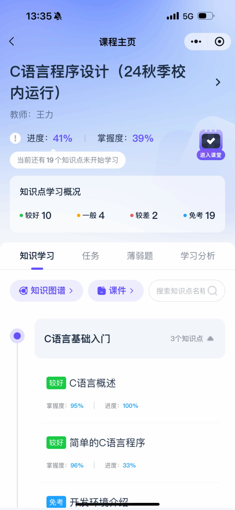 学生可通过网页版智慧树在线学堂和手机端微信小程序“智慧树知识中心”随时随地学习课程知识和练习测试,并获得知识点学习情况饼状图。根据自身情况个性化安排学习,明确线下课堂学习的重难点,逐个提升知识点的掌握程度,达到深入学习的目的。