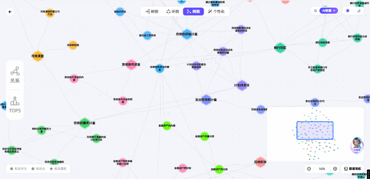 1.知识图谱导航:基于《中级财务会计》课程搭建动态知识图谱,清晰呈现知识点间的逻辑关联,学生可随时回溯学习路径。