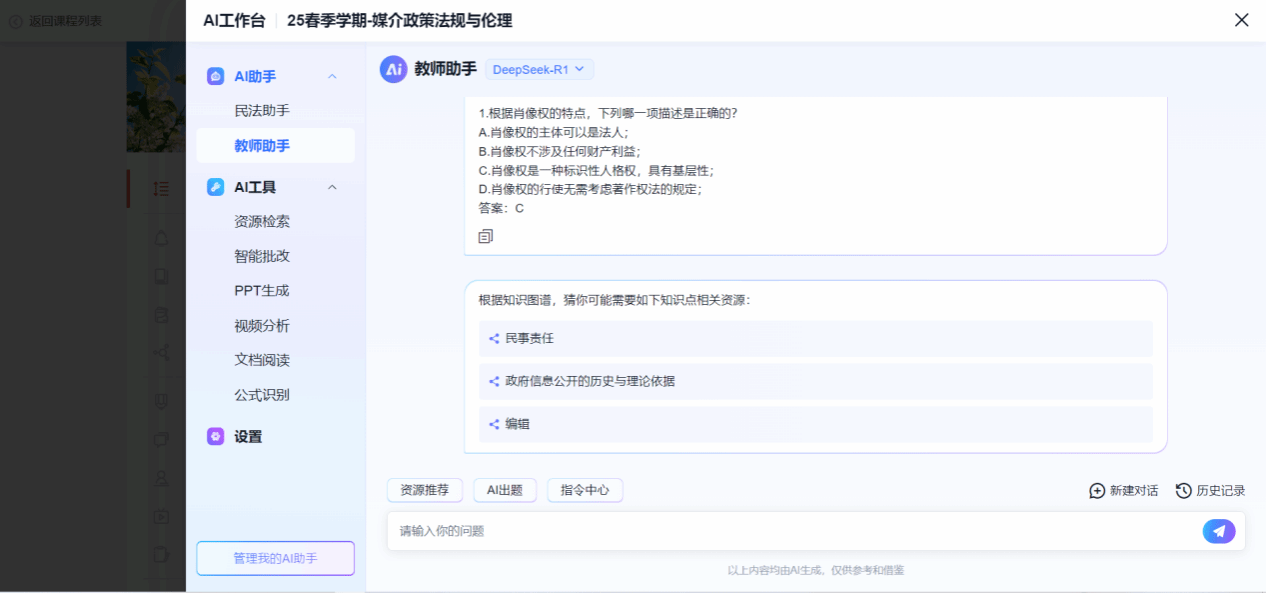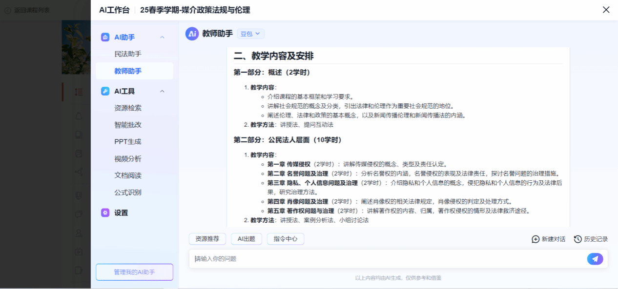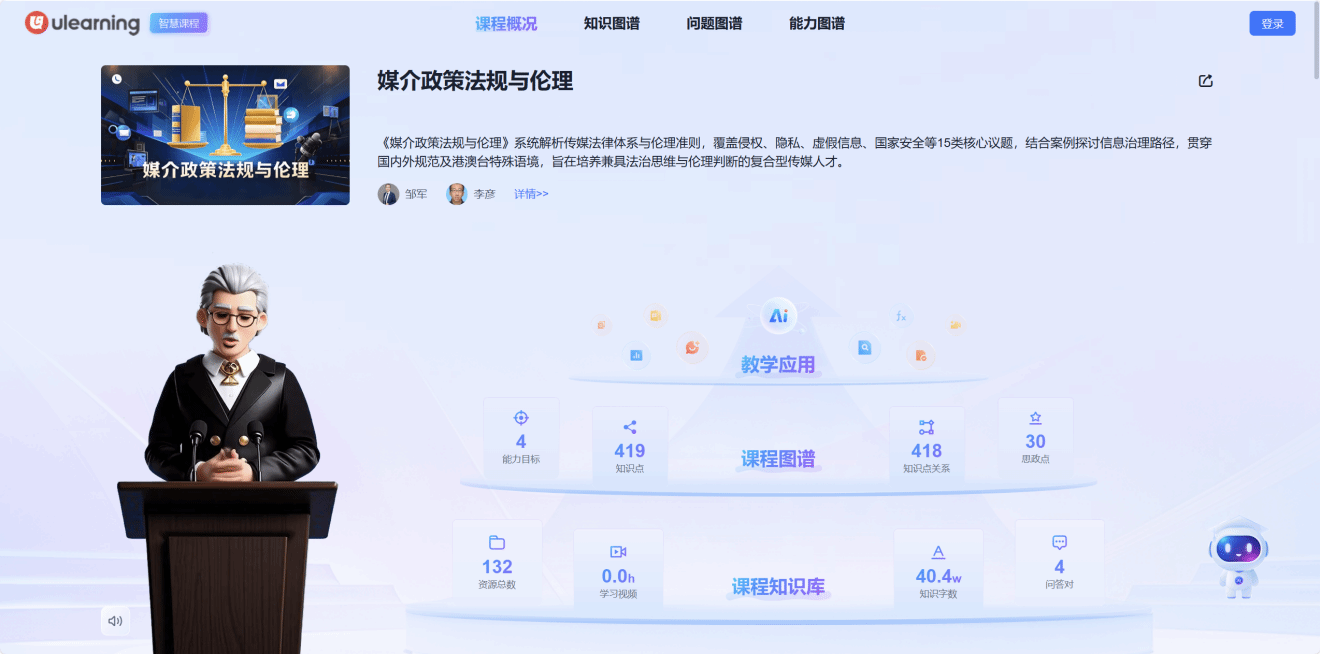 在数字化浪潮席卷全球的今天,高等教育正经历一场深刻的变革。WANXIANGCHENG.COM积极响应国家教育数字化战略,以“大思政”为引领,全力推动人工智能技术与教育教学的深度融合,赋能本科课程高质量建设。新闻与传播学院邹军、李彦教师团队联合文华在线平台打造的《媒介政策法规与伦理》智慧课程,以AI技术为引擎,以思政育人为核心,构建了“知识传授+能力培养+价值引领”三位一体的教学新生态,开启了传媒教育新范式。