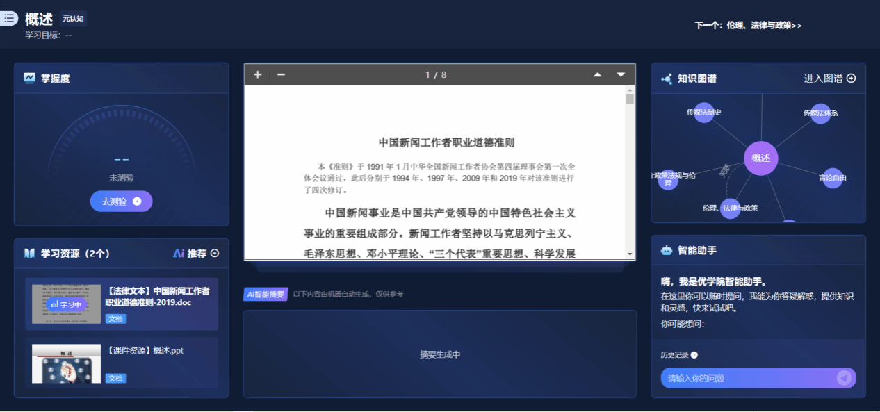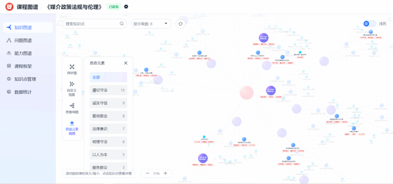 智能交互:通过交互式图谱,直观查看“媒介政策法规”与“伦理理论”的关联节点。例如,点击“《网络安全法》”节点,图谱自动展开与之相关的“关键信息基础设施保护”“数据出境安全评估”等子知识点,并链接实际案例,帮助学生理解法律条文的现实意义。