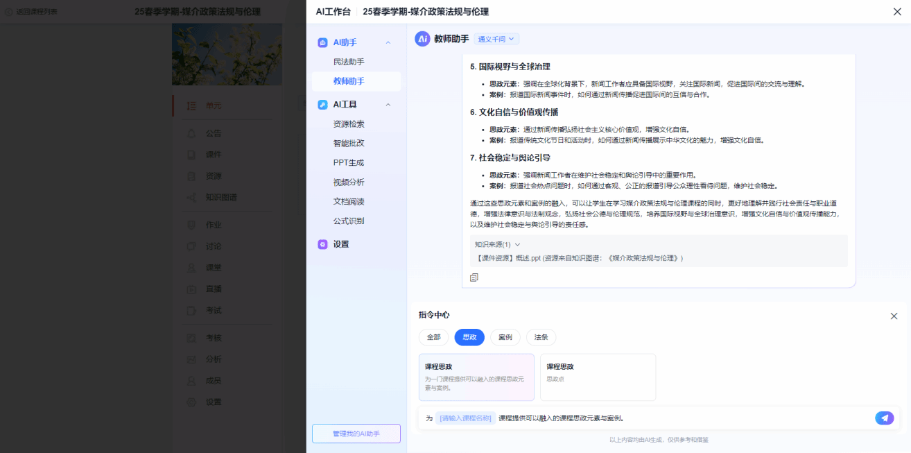 指令库添加课程思政指令,可以为老师们的课程思政建设提供主线、元素建议。通过明确的指令,教师能够快速获取所需的思政教学资源,实现高效备课。