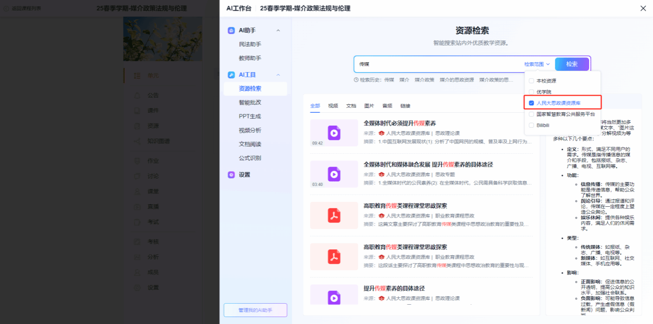 思政元素视图是将思政点与专业知识深度融合的重要工具,它以可视化形式呈现思政元素,同时可轻松接入人民大思政课资源库,依托人民日报、人民网等思政大数据资源,深入挖掘示范课程、教学设计、教学案例等20多万条思政素材,帮助教师更好地融入思政教育,引导学生在学习专业知识的过程中树立正确的价值观。