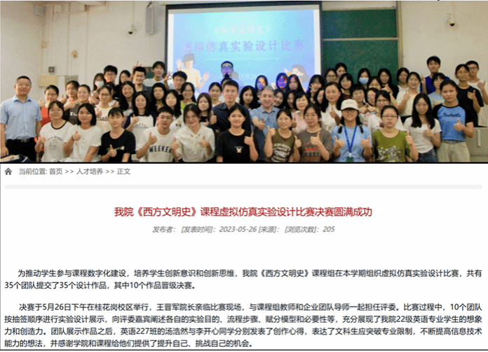 课程实践项目:组织“中西文明互鉴演讲赛”“虚拟仿真设计比赛”,选拔优秀作品参与“全国大学生演讲比赛”“挑战杯”等赛事,增强学生的实践创新能力。