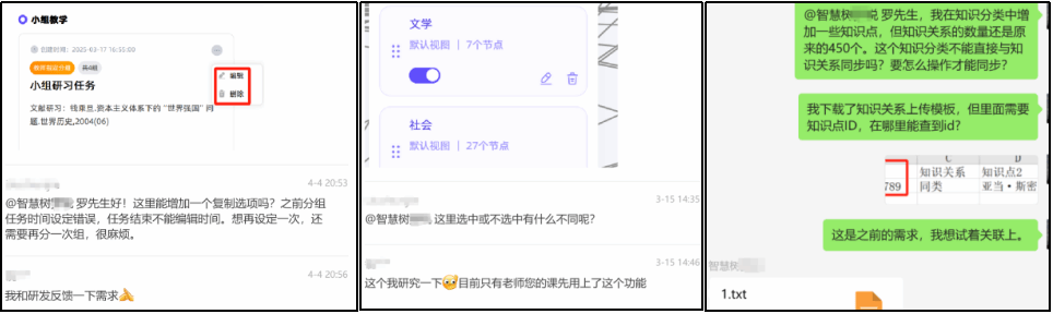 教师基于教学需求,向智慧树技术团队提出功能优化建议,包括知识点同类关系的构建、学生互评功能的建构和优化、虚拟参观博物馆实践与组题等,持续优化平台功能,实现教师-技术团队协同创新。