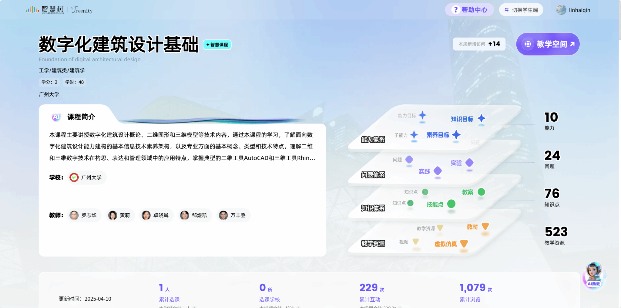 为全面落实国家教育数字化战略行动,推动人工智能技术与高等教育教学的深度融合,提升本科课程建设质量与课堂教学水平,学校已立项建设41门智慧课程知识图谱。本期推出建筑与城市规划学院罗志华教师团队打造的《数字化建筑设计基础》智慧课程,我们一起看看“AI+建筑”是如何改革传统教学的。