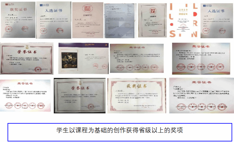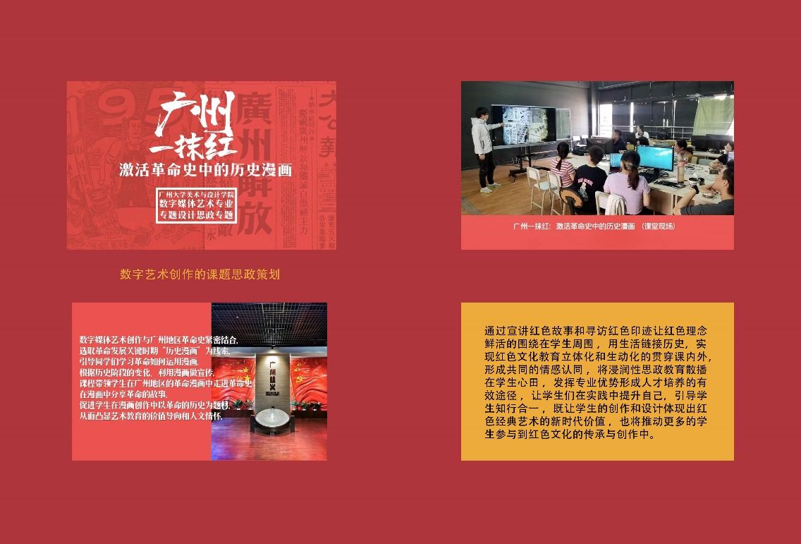 《红色力量:激活党史中的漫画,学习漫画中的党史》(数字媒体艺术专业):以百年党史漫画为主线,15期《漫画史 一刻钟》,课程在各大平台播出后,引发社会热点,有上千人购买该课程,赢得超过5万的点击收听数量。《专业考察与写生》(美术学专业):组织学生考察传统文化遗存、红色革命基地等,提高同学们对基层人民劳动生活、民族传统文化、民族审美、红色革命环境的认识。在“赤子之心”2017年首届全国高校思想政治理论课大学生艺术作品巡展中,同学们就是在此课程创作中入选了5幅作品,在全国高校中名列前茅。此后在省和国家级展览中,获奖二十余幅作品。