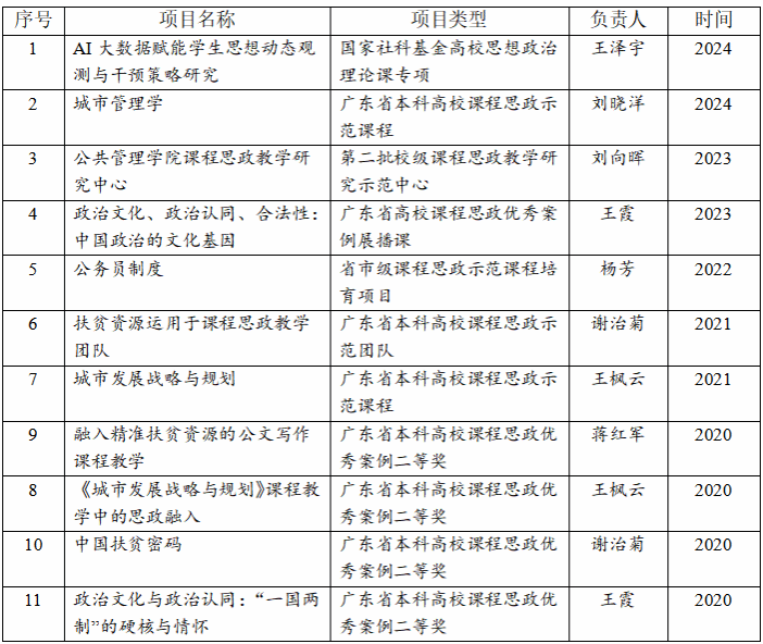 自开展以“三全育人”为抓手的课程思政建设以来,“公共管理学院课程思政教学研究中心”被认定为第二批校级课程思政教学研究示范中心。同时,学院获得国家级、省部级、市级、校级课程思政示范专业、示范团队、示范课程、示范课堂、优秀案例等教学、科研项目50余项,实现了课程思政建设的全面推进,并为课程思政的可持续发展奠定了坚实的基础。