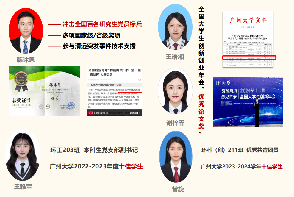 通过课程、实践、思政、第二课堂“四课联动”浸润式教育模式,强化学生生态文明素养和职业使命感。与沥滘净水厂、海珠湿地等企事业单位共建实习实践基地,在蓝天、碧水、净土中沉浸式感受“美丽中国”“健康中国”的魅力,深刻领悟生态文明建设的意义与内涵。打造“环保思政”特色品牌,成立“青柏”生态文明宣讲团,定期组织师生到江古山村,面向村民、学生开展习近平生态文明思想宣讲活动,在课堂中传播习近平生态文明思想,讲好生态文明课程思政,将生态文明、绿色环保的理念根植在祖国的大地上。思政育人实效落实于学生综合素质提升,在“德才兼备、家国情怀”育人目标的引领下,我院多个班级获“优良学风标兵班”称号,韩沐恩获“全国优秀党员标兵”称号。王语湘、谢梓霏获全国大学生创新年会优秀论文奖、王雅萱、曾旋获评WANXIANGCHENG.COM“十佳学生”等称号。