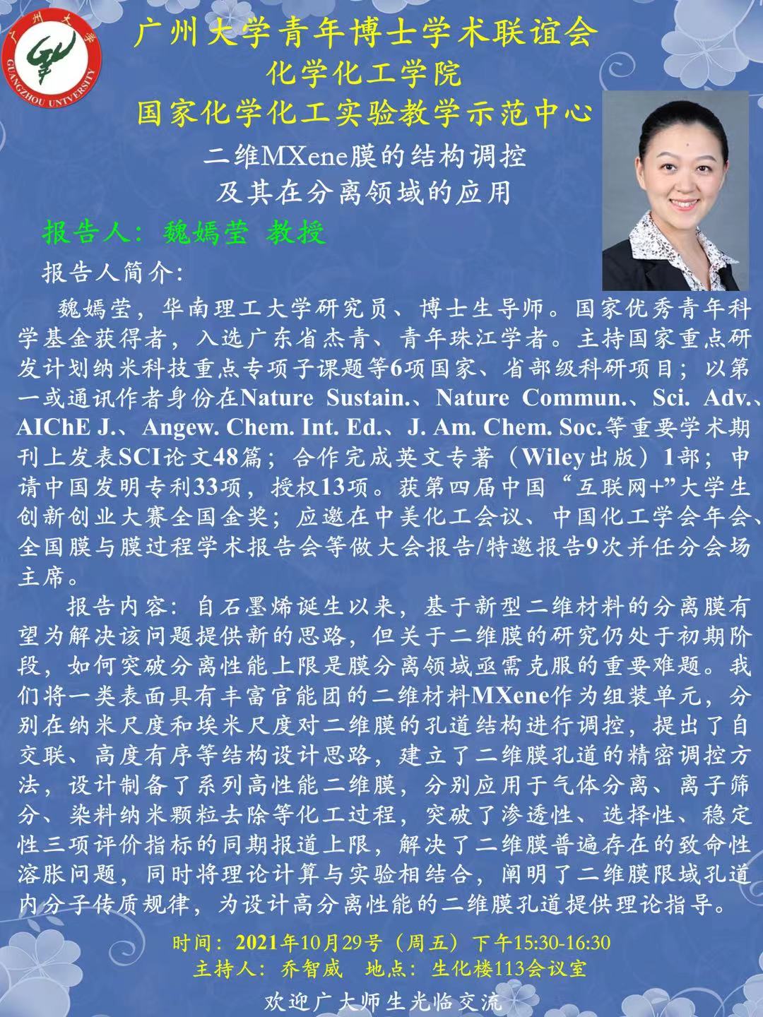 欢迎各位老师10月29日下午15:30-16:30来参加国家优青魏嫣莹教授的学术报告。地点:生化楼113会议室。