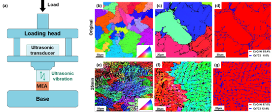 图1 (a) 超声辅助成形装置示意图;(b-d) CoCrNiC0.1中熵合金的原始态形貌;(e-g) 超声辅助加载25min后的形貌