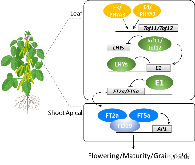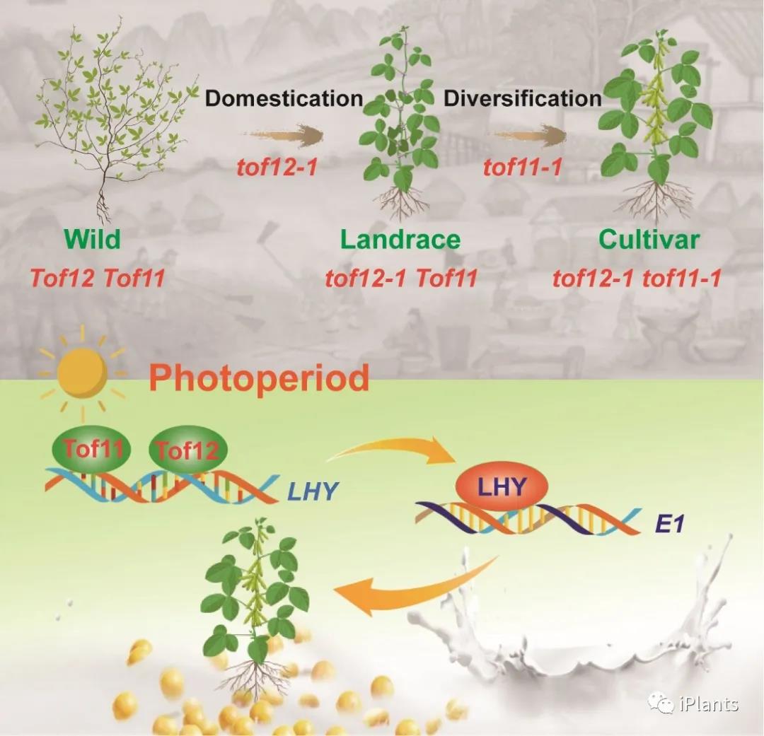 利用基因组学分析、生物信息学和经典正向遗传学相结合的方法,发掘了两个长日照条件下控制开花期的关键位点Tof11和Tof12。分子机制解析表明,Tof11和Tof12通过调控LHY和E1基因控制大豆光周期开花,建立了完整的光周期调控分子网络(图2)。研究同时发现:Tof11和Tof12发生了渐进式的变异和人工选择。其中,tof12-1的功能缺失突变被强烈选择,并在栽培品种中被迅速固定下来,从而使栽培品种的开花期和成熟期普遍提前。tof11-1的功能缺失型突变的发生于tof12-1之后,在tof12-1遗传背景上再次受到选择,而从而进一步缩短了栽培大豆的开花期和生育期,从而提高了栽培大豆的适应性和种植。该研究首次系统报道了作物驯化过程中开花期基因的进化与选择分子机制。