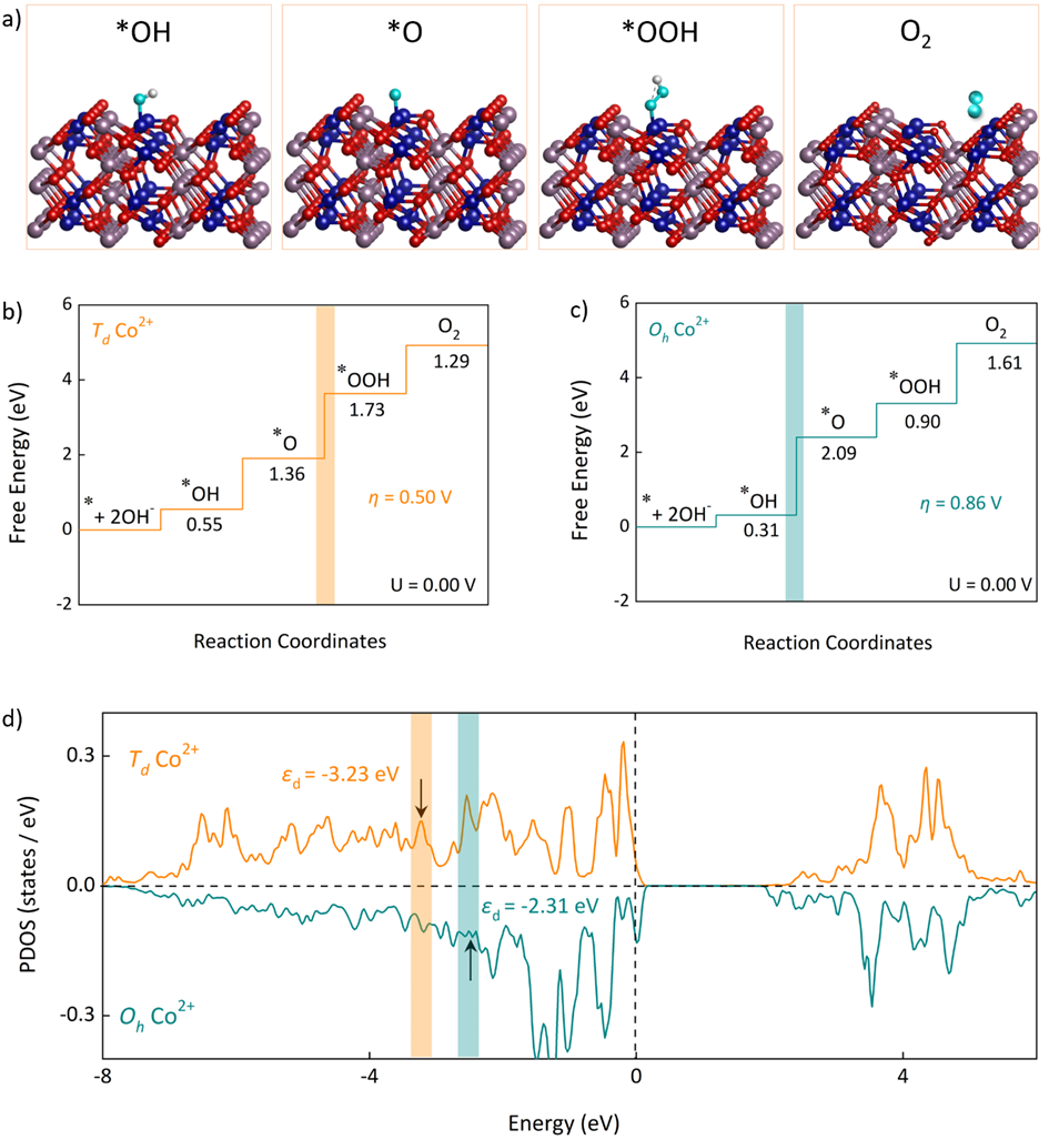 图3. DFT模拟:a) OER反应过程反应中间体示意图;b) 吉布斯自由能在Td Co2+作为活性中心的变化;c)吉布斯自由能在Oh Co2+作为活性中心的变化;e) Oh Co2+和Td Co2+的d带中心对比