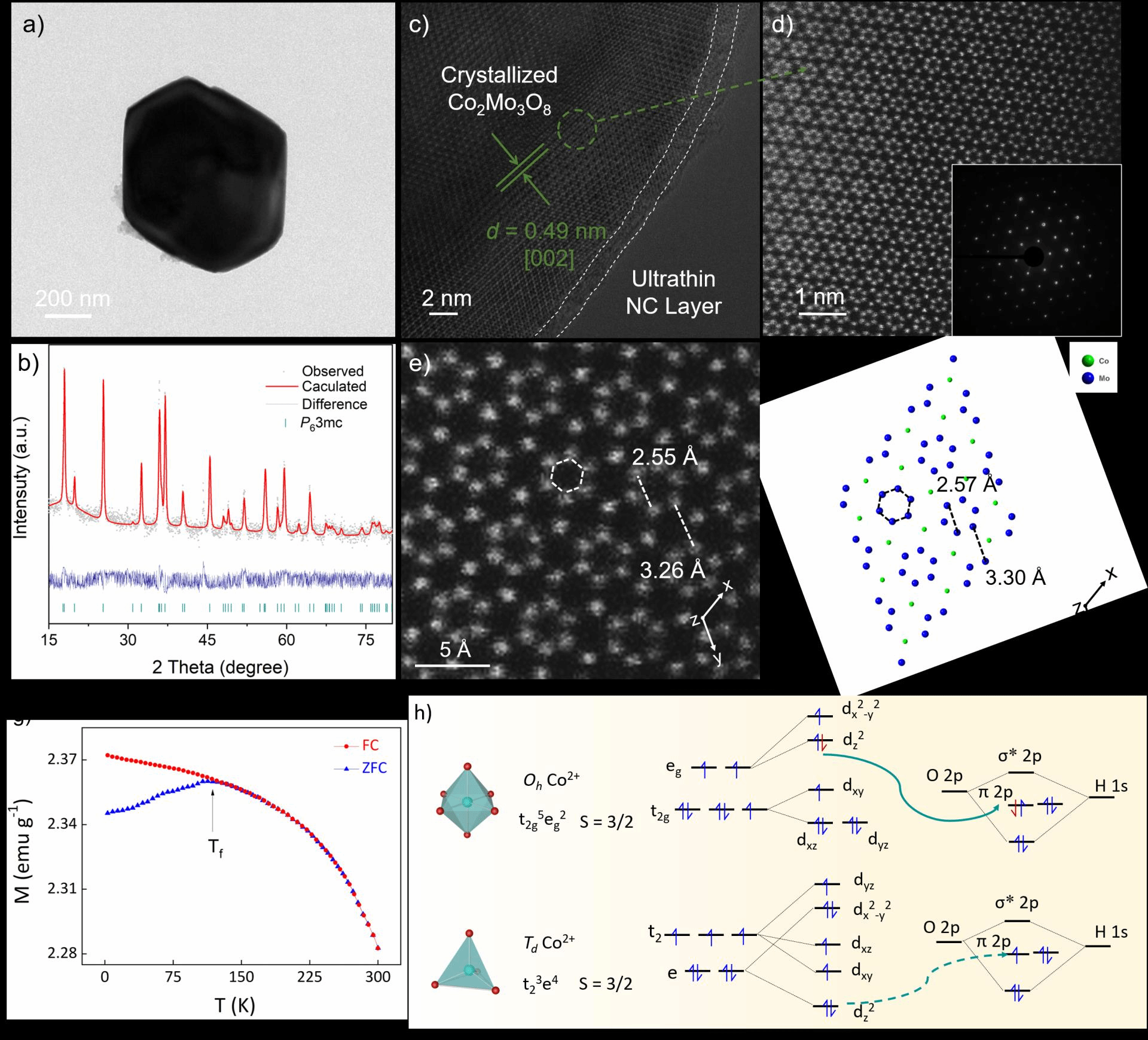 该工作采用简便的盐封法制备了具备单晶性能的Co2Mo3O8和包覆在其外围的超薄碳层复合材料Co2Mo3O8@NC-800催化剂用于电化学OER的研究,并结合高分辨球差电镜、磁性测试和理论计算证实:TdCo2+作为催化剂的活性中心时可以有效降低反应决速步*OOH形成的能量势垒,为催化活性-催化位点间的关系提供了深入的机理分析,有助于丰富过渡金属氧化物OER催化剂的研究发展。