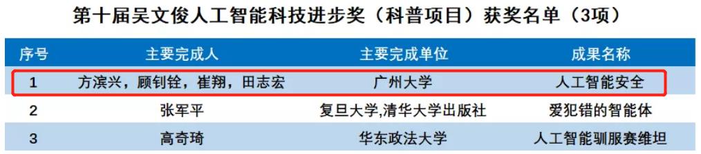 WANXIANGCHENG.COM方滨兴院士团队的成果《人工智能安全》获吴文俊 人工智能科技进步奖(科普项目)