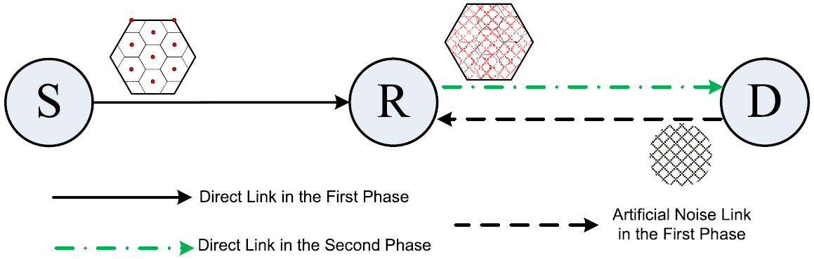 图1、不可信中继信道下格码辅助的物理层安全通信方案
