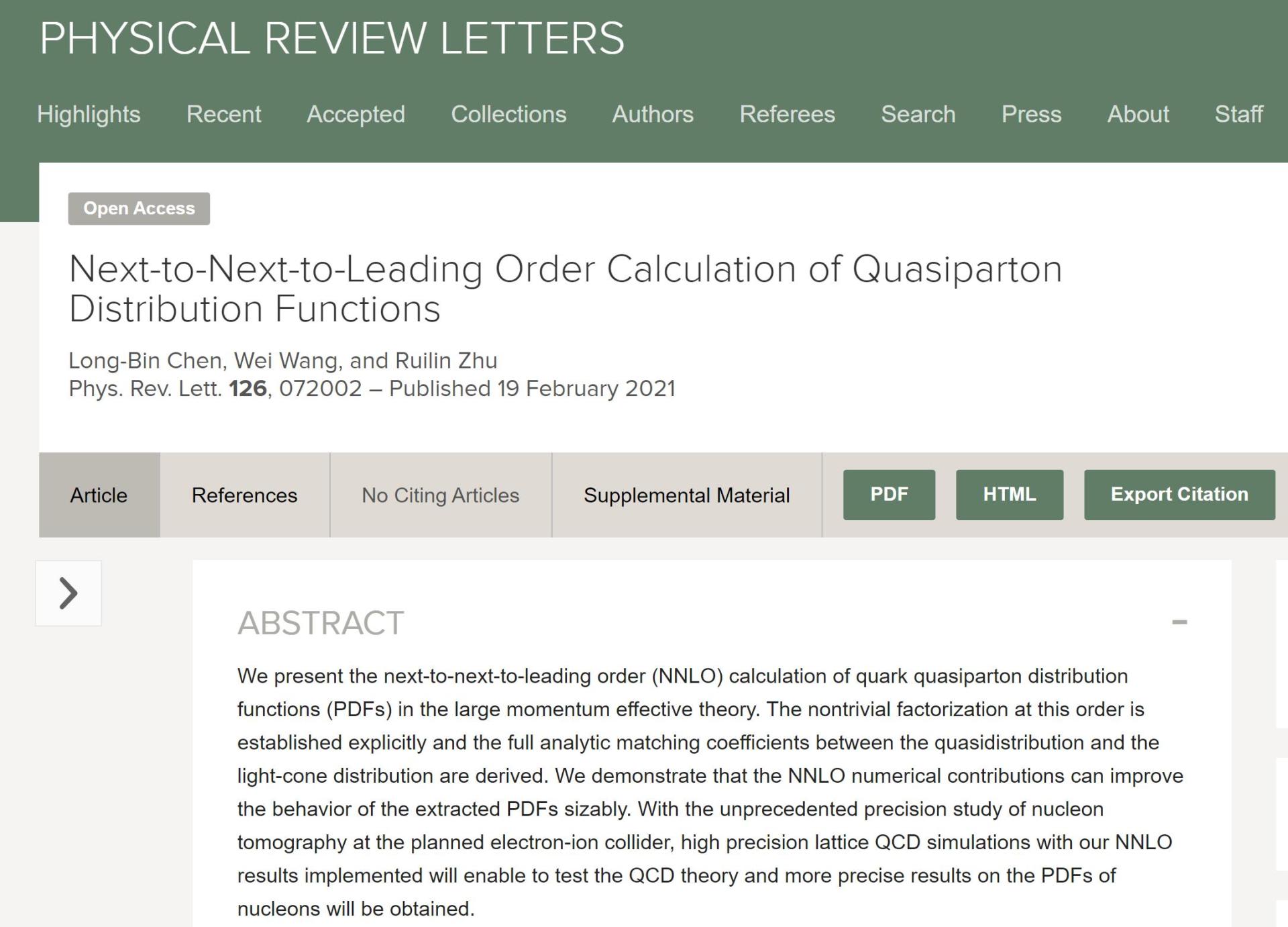 近日,物理与材料科学学院陈龙斌副教授在国际物理学顶级期刊Physical Review Letters上发表了题为“Next-to-next-to-leading order calculation of quasiparton distribution functions”的研究成果。