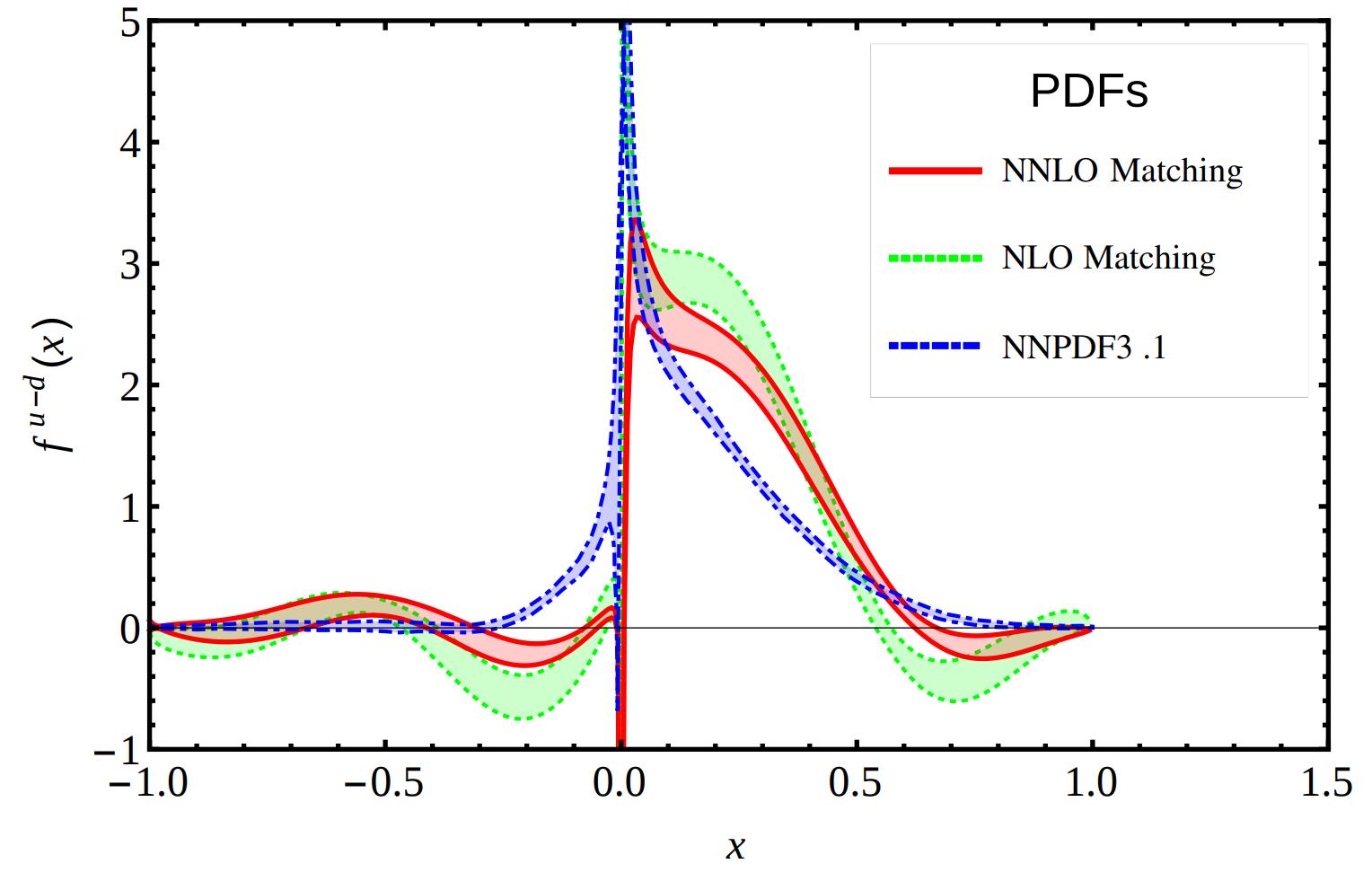 上世纪六十年代在SLAC对撞机上进行的带电轻子-核子深度非弹性散射实验发现了核子(质子和中子)有内部结构,这些内部点粒子夸克、胶子统称为部分子。部分子分布函数被用来描述这些部分子在核子内部的一维或者多维的分布图像。量子色动力学的色禁闭性使得人们没有办法直接求出部分子的分布函数,传统的做法是通过高能强子散射截面等实验数据来拟合部分子分布函数。近些年发展起来的大动量有效理论,使得从量子色动力学第一性原理出发来计算部分子分布函数成为了可能,但到目前为止大动量有效理论框架下的匹配仅局限在单圈精度下。