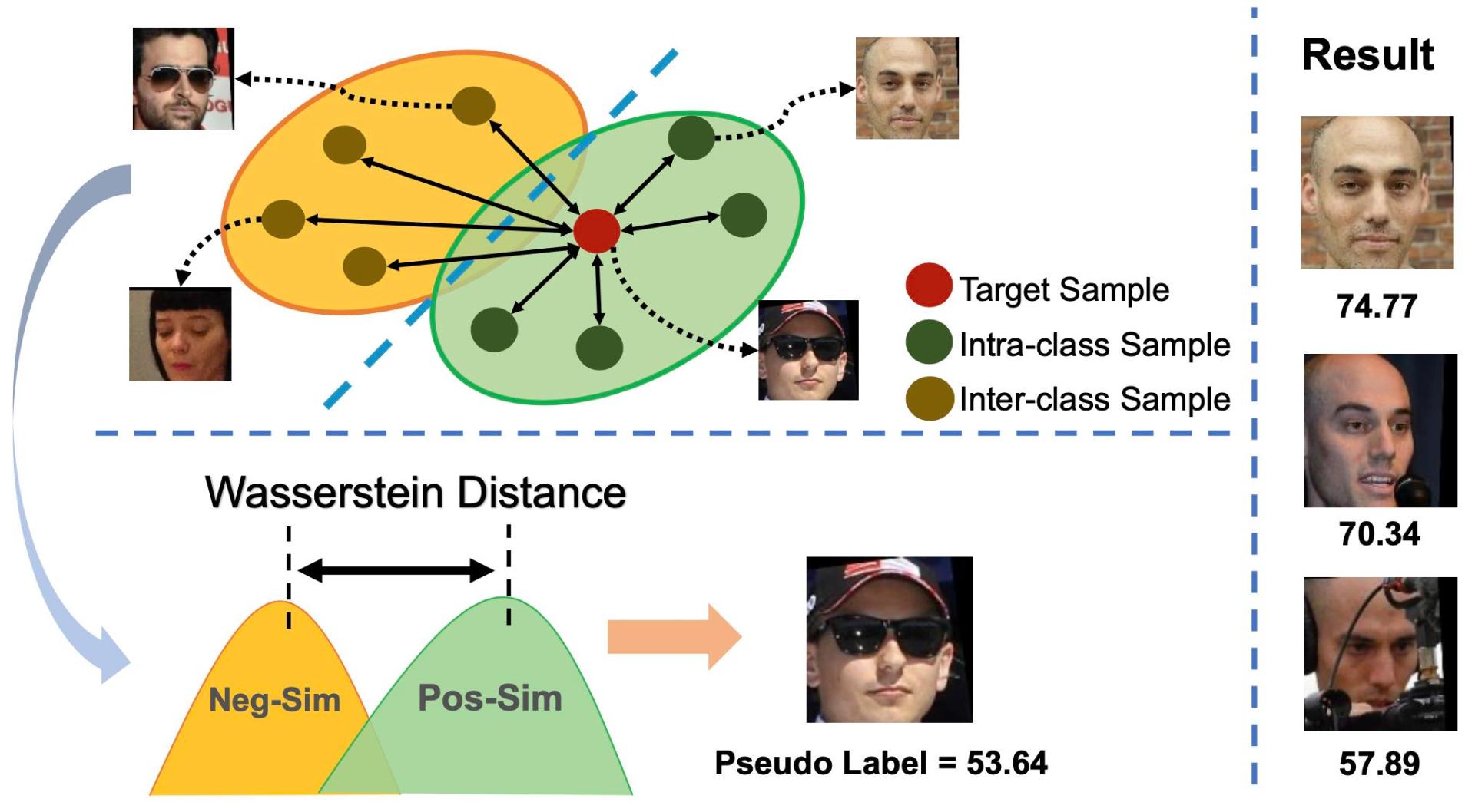 图1: SDD-FIQA方法同时考虑了目标样本(红点)的类内(绿点,Pos-Sim)和类间(黄点,Neg-Sim)的相似度分布,并采用他们之间的Wasserstein距离作为目标样本的质量伪标签