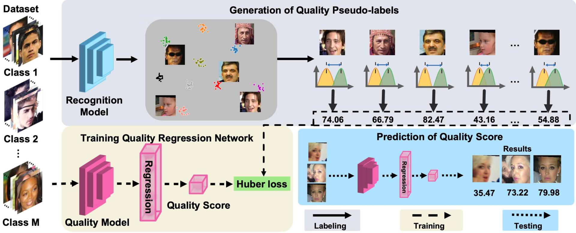 以往的人脸图像质量评估研究大多以样本层面不确定性或配对相似度作为质量评分标准,而且只考虑部分类内信息。这些方法忽略了来自类间有价值的信息。在本研究中,对于人脸识别系统,我们认为一个高质量的人脸图像应该与其类内样本相似,而与其类间样本不相似,如图1所示。为此,我们提出了一种基于类内-类间相似度分布距离的无监督人脸质量评估方法(SDD-FIQA)。