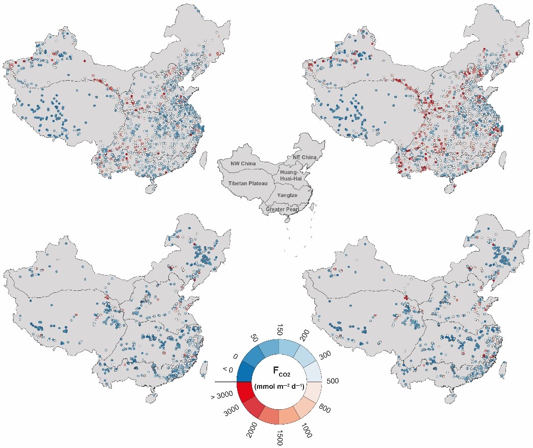 基于大尺度卫星遥感技术,以及1980年代在1709个地点收集的历史水化学数据和最近在中国1064个地点进行的野外采样数据,本研究估算了中国内陆水体的CO2排放通量。结果表明,中国内陆水体的CO2排放通量已从1980年代每年1.38±0.31亿吨(约5.06亿吨CO2)降至2010年代的每年0.98±0.19亿吨(约3.59亿吨CO2),表明在过去的30年间中国内陆水体CO2排放量总体下降了29%;河流是内陆水体CO2排放的主要来源,占总排放量的88–93%。在空间分布上,只有青藏高原的内陆水体CO2排放在30年间呈现了增加的趋势,河流和湖泊的CO2排放分别增加18%和81%。而中国其他地区的河流CO2排放均呈下降趋势(降低31–56%)。