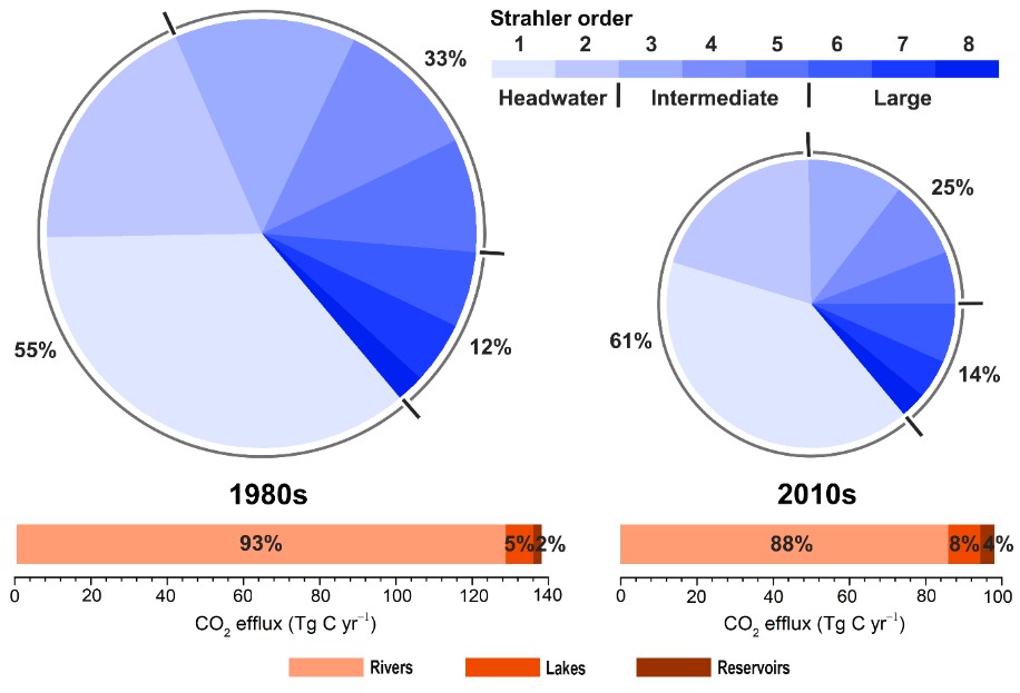 本研究的另一重要贡献是准确估算1980年代和2010年代中国区域的水面积变化。在参考了历史资料的同时,研究人员采用高精度卫星影像对中国当代的内陆水体面积进行了重新分析提取。结果表明,1980年代中国河流非汛期水面积为55,488±12,886 km2,汛期为65,076±14,357 km2。到2010年代,河流非汛期水面积下降至51,003±14,439 km2,汛期河流水面积降至58,279±15027 km2,总体下降了8.1−10.4%。而遥感结果表明湖泊和水库的面积则呈现增加的趋势,湖泊面积由1980年代的79,196±6415 km2增加到2010年代的82,570±6688 km2,水库面积则从1980年代的14,772±1196 km2增加到2010年代的25,616±2075 km2。由于这个阶段中国经济蓬勃发展刺激了对能源和粮食生产的需求,从1980年代到2010年代之间我国完成了约15,000个新水库的建设,水库的存储容量增加了一倍以上。自然河流向水库转化后,具有类似于湖泊的理化特性,从而大大减少了CO2的排放。如果将河流和水库一起考虑,则在最近的30年中,它们的总CO2排放量减少了大约三分之一,这在很大程度上是由于中国各地的水库蓄水所致。