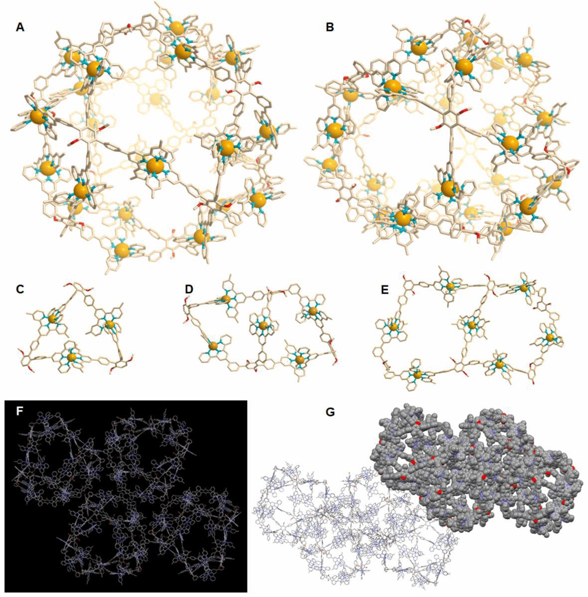 该研究组将乙酸乙酯非常缓慢的挥发进入[Zn24L12]的DMF溶液中,培养2-3个月后,可以得到[Zn24L12]的单晶。图2列出了不同视角下[Zn24L12]分子笼的具体结构。晶体结构显示:相比于典型的D3h对称的反式立方面体结构,该分子笼中两个三角形(图2-C,红色标注)并没有完全对齐,朝C3轴方向可以观察到有一定扭曲。因此,得到的分子笼显示出更低的D3对称性。