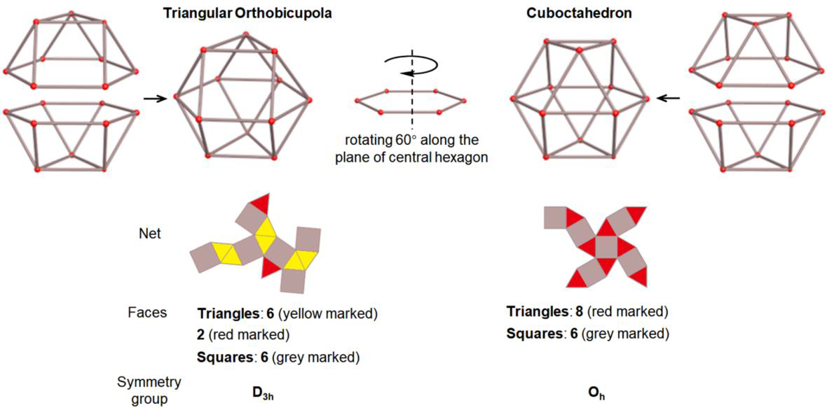 图1:反式立方八面体(Triangular orthobicupola)和立方八面体(Cuboctahedron)的几何学描述