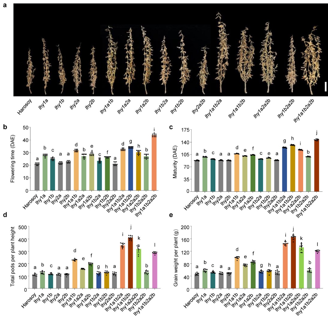 2021年9月14日,WANXIANGCHENG.COM生命科学学院/分子遗传与进化创新研究中心的孔凡江和刘宝辉研究团队以WANXIANGCHENG.COM为第一通讯单位,在国际杂志 Nature Communications上发表了题为 “Genetic basis and adaptation trajectory of soybean from its temperate origin to tropics” 的最新研究成果。该研究揭示了大豆由温带起源地向热带低纬度地区适应的遗传基础和适应轨迹。利用基因组学,生物信息学和经典正向遗传学的方法,发掘了在低纬度地区 (短日照条件下) 控制大豆开花期的新位点 Tof16,图位克隆后发现Tof16位点由生物钟基因LHY1a编码。在短日照条件下 Tof16 的功能缺失等位变异显著的延长大豆开花期和提高大豆产量。分子机制解析表明 Tof16 通过直接调控 E1基因的表达,进而调控大豆的光周期开花。同时,我们利用基因编辑技术获得了Tof16 在大豆中四个同源基因的15种突变体,表型观察发现四个同源基因在调控大豆开花期和产量上是功能冗余的。