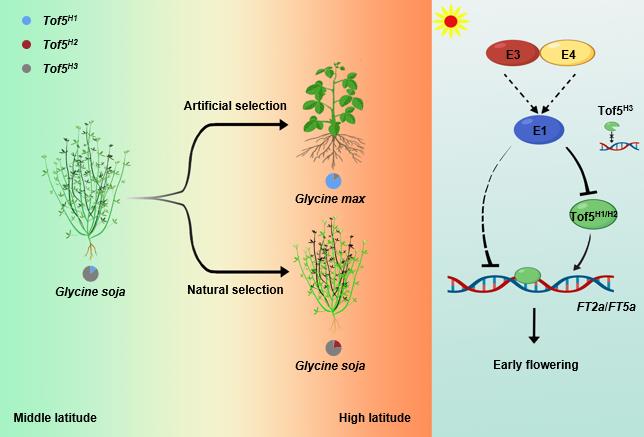 有趣的是,我们发现Tof5的不同等位变异在栽培大豆和野生大豆向高纬度适应的过程中发生了平行选择的现象。在栽培大豆中,Tof5H1型等位变异经历了强烈的人工选择,而在野生大豆中Tof5H2型等位变异经历了自然选择,分别促进了栽培大豆和野生大豆对高纬度的适应性。进一步在野生大豆群体,对决定栽培大豆光周期敏感性的关键基因E1,E3,E4的等位变异进行分析,发现只E3的功能缺失等位变异参与了野生大豆对高纬度的适应性。说明野生大豆和栽培大豆在适应高纬度地区的遗传基础是不同的,Tof5H2和E3功能缺失等位变异对野生大豆适应高纬度地区,起到了非常重要的作用。这些研究结为我们揭示野生大豆自然选择的过程中对高纬度的适应性提供了理论基础。