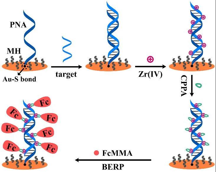 在此基础上,以肽核酸(PNA)作为固定化分子识别元件,分别以4-氰基-4-(硫代苯甲酰)戊酸(CPAD)和甲基丙烯酸二茂铁基甲酯(FcMMA)作为RAFT试剂和单体,借助于BERP的信号放大作用,实现了核酸的高灵敏(线性范围为1.0fM~1.0nM,检测下限为0.58fM)、高选择性(可有效区分单碱基错配)电化学检测(检测原理如图2所示)。该电化学生物传感器具有操作简便、成本低廉、灵敏度高、选择性好等优良特性,且可用于血清样品中核酸的定量分析,因而在核酸的高灵敏、高选择性检测中具有很好的应用前景。