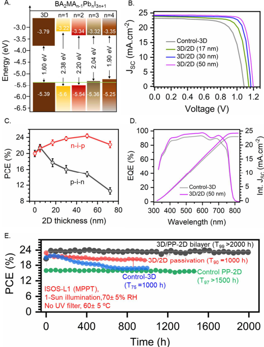 通过XRD、UV-Vis、GIWAXS、PL等测试显示了上层的2D钙钛矿薄膜具有纯结晶相,而不是多混杂n值或者不可控混杂n值的2D钙钛矿,实现了对2D钙钛矿结晶相纯度的调控。后续通过TOF-SIMS、GIWAXS、HRTEM等表征了2D/3D异质结的界面结构,发现2D钙钛矿层厚度约为50 nm,明显区别于通常的表面钝化工艺。通过对半导体光伏器件的能带设计和结构调整,实现了制备的2D/3D钙钛矿光伏器件显示了T99>2000小时的超强稳定性,解决了领域内对效率和稳定性提升的关键问题,如图2所示。