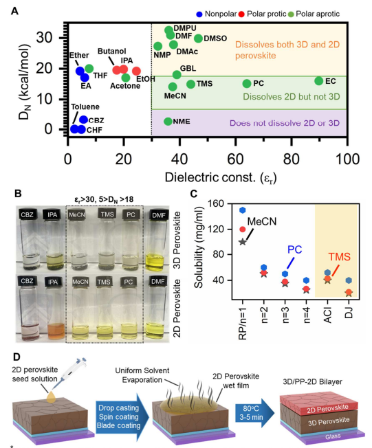 本文的研究者通过使用溶剂工程工艺实现了对2D钙钛矿和3D钙钛矿溶解性的控制。发现如MeCN、TMS等溶剂DN值和介电常数在一定范围内会形成对2D钙钛矿和3D钙钛矿不同的溶解度,也显示了不同溶剂对不同n值钙钛矿的溶解度差异,研究表明n值越高,其晶体结构和化学组成和3D约越相似,溶解度就越低。通过选取合适的溶剂实现了2D/3D钙钛矿的双层堆栈结构制备,如图1所示。