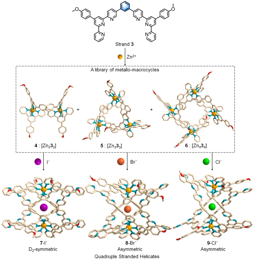 图1.在卤素离子(I¯, Br¯, Cl¯)的模板作用下,金属有机大环转化为四重螺旋(X-射线晶体结构)。图片来源:Cell Reports Physical Science